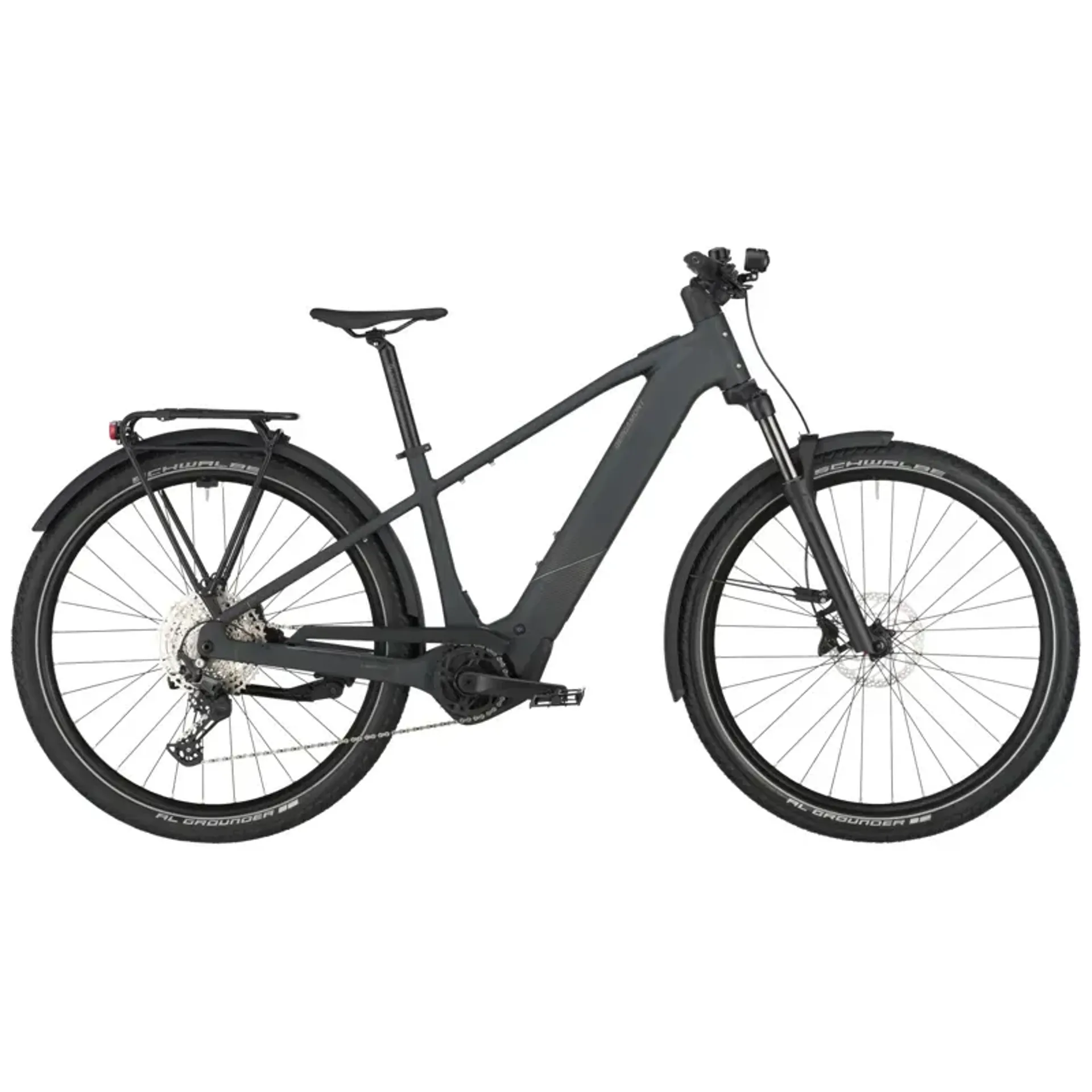 The E-Revox Tour Wave is a fully equipped e-mountain bike with perfectly integrated lights, fenders, kickstand and a rear carrier that is approved for child transportation in combination with a Thule Yepp 2 Maxi seat.