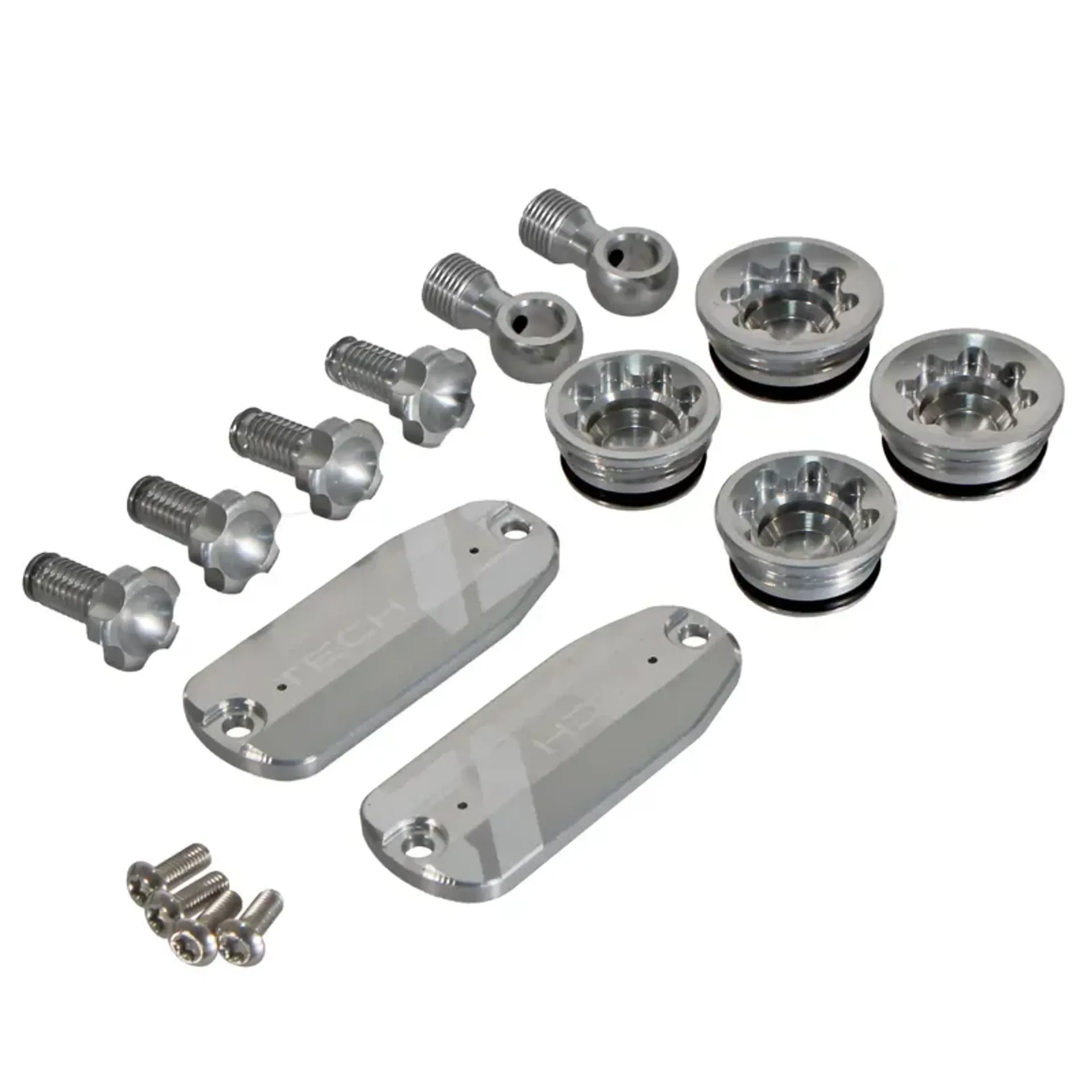 Kit includes the following: 2x master cylinder lid, 4x lever adjuster screw, 4x bore cap, and 2x 90-degree connector.