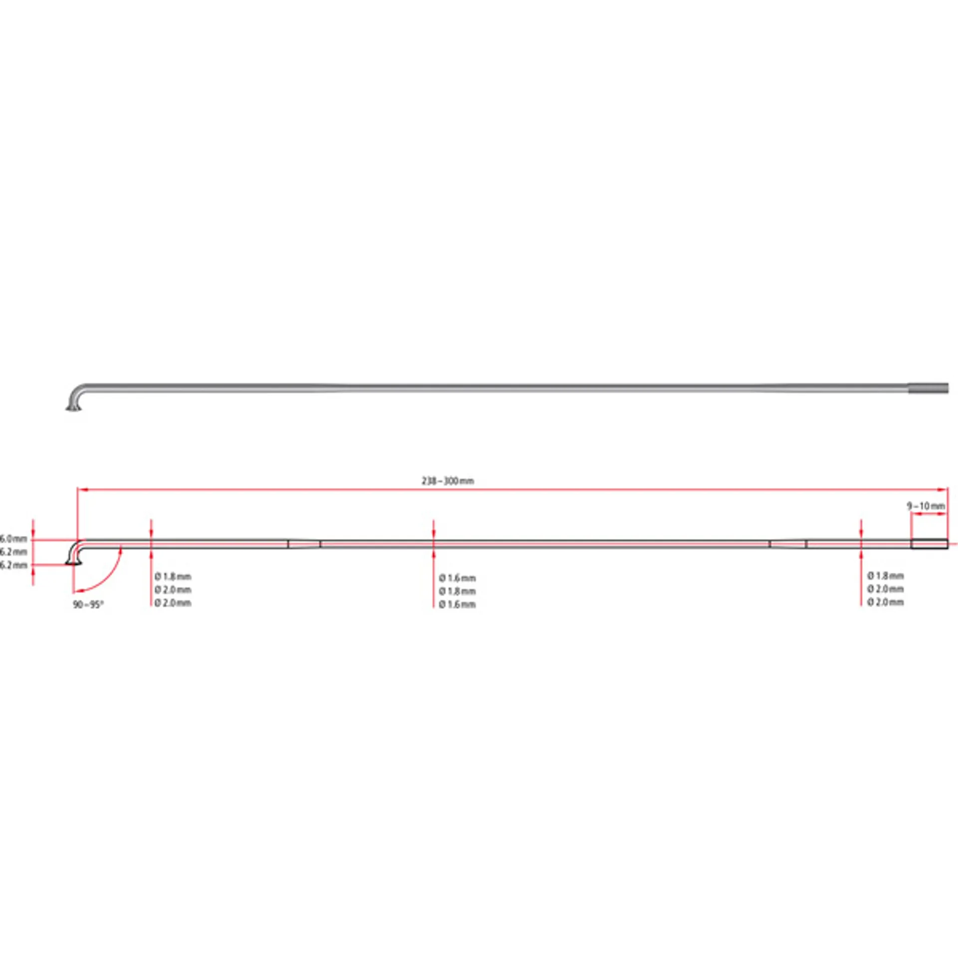 The 14/15 gauge double butted spoke is 1.8 mm thick in the centre to save weight, but 2mm thick at the end where strength is needed.