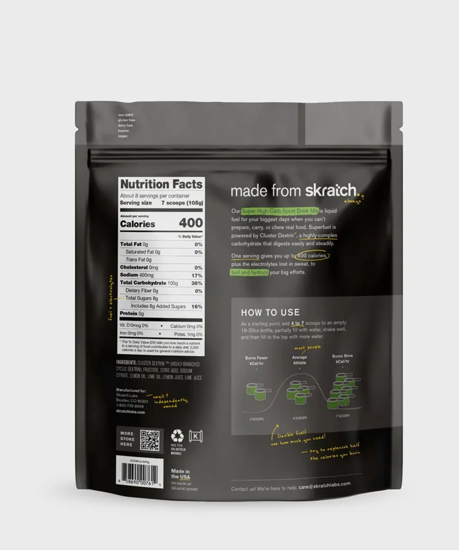 One serving of Superfuel gives you 400 calories, powered by Cluster Dextrin™, plus the electrolytes lost in sweat to fuel and hydrate your biggest days.