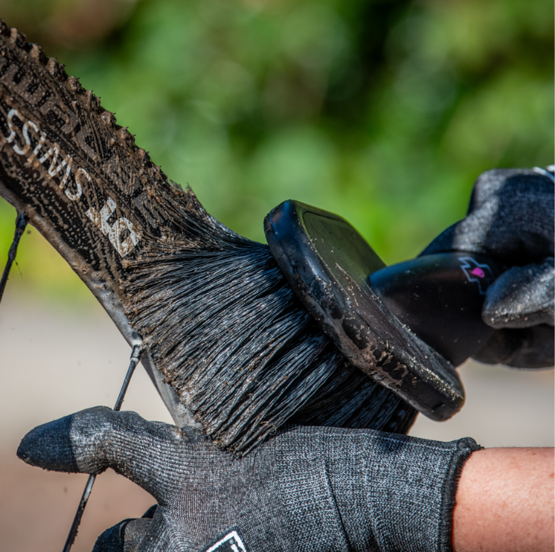 • Soft Washing Brush:features a sintered bristle compound that's designed to clean your wheels and components while caring for delicate finishes. Its new design has a tough, impact resistant handle that won't slip in extreme conditions, an oversized head for fast cleaning of large areas and rubberised impact zones for maximum protection.