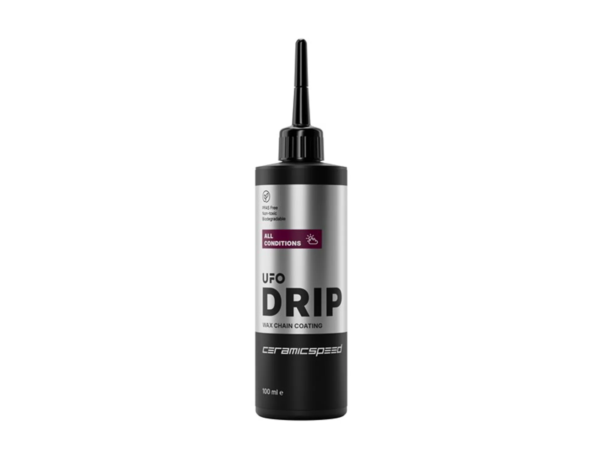 Our acclaimed UFO Drip Chain Coating has been updated to be known as UFO Drip All Conditions. Now, in a new, smaller bottle size and an optimized formula that has a crisp white appearance while applying, that virtually disappears once fully dry.