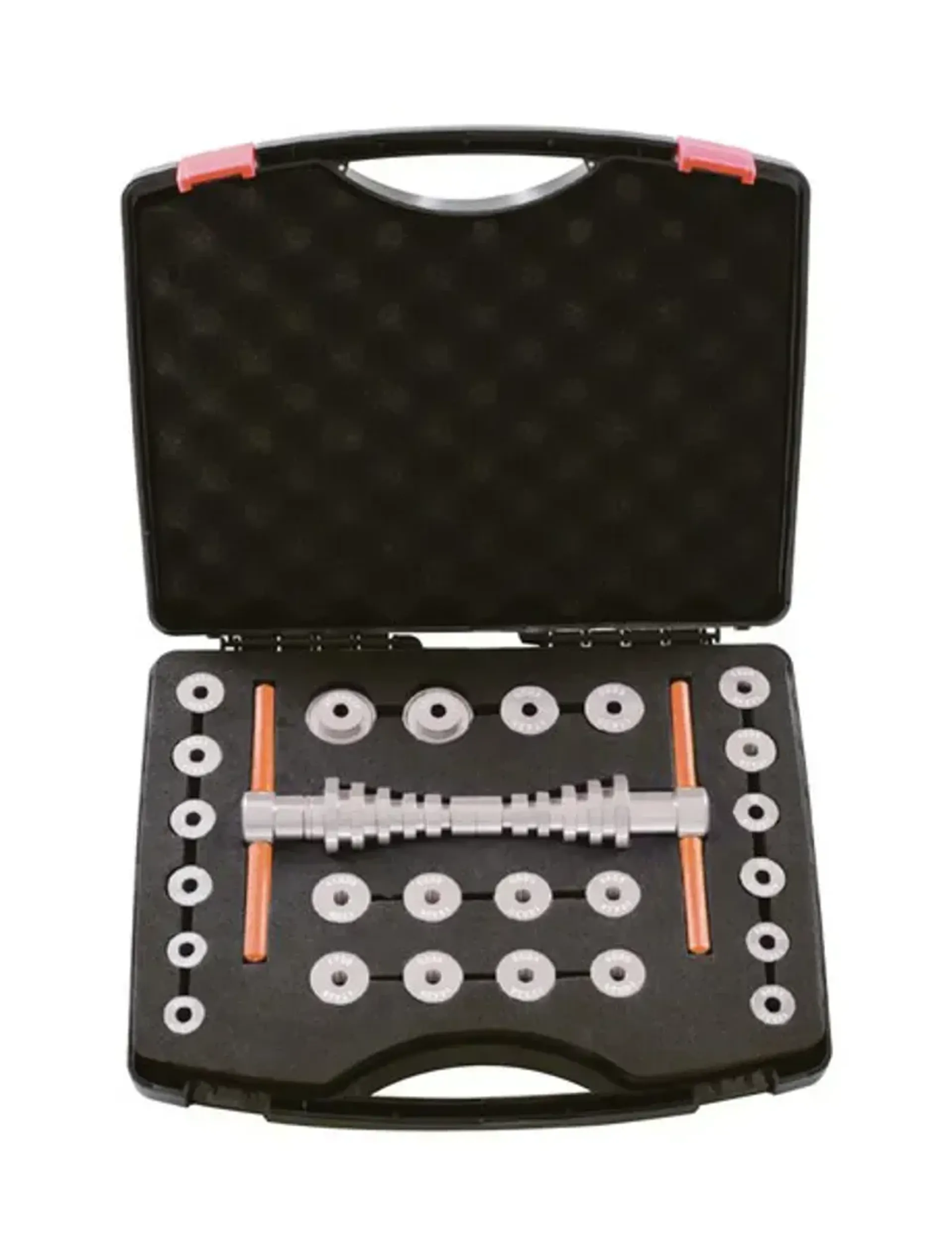 This case contains pressers for bearing sizes: 1526, 1728, 608, R6, 6000, 6001, 6800, 6801, 6802, 6803, 6804, 6805, 6806, 6900, 6901, 6902, 6903, BB30, BB70, BB86, BB90, BB92. The pressers are made from 7075 aluminium alloy with CNC machining treatment and anode hard oxidation treatment.