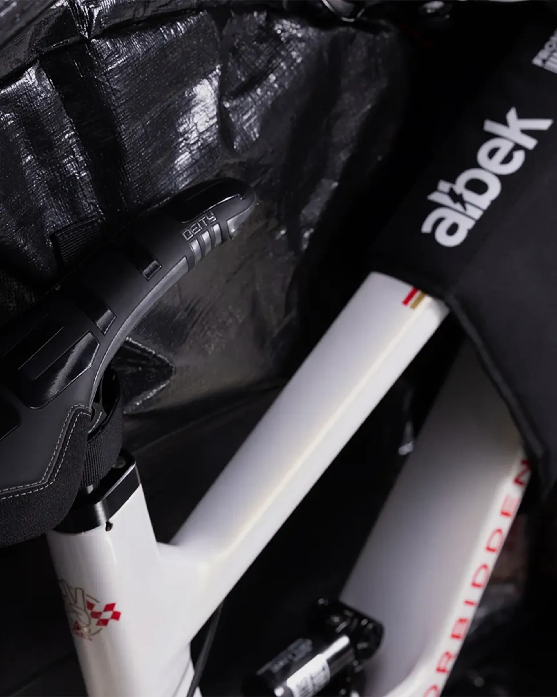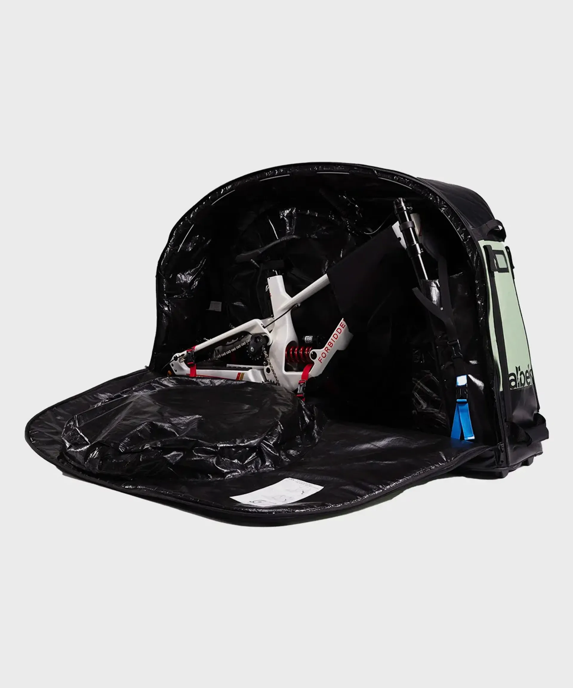 Featuring Albek's moulded lightweight reinforced honeycomb base, reinforced wheel assembly, padded wheel pouches, and an EVA frame stand that stabilises your frame.